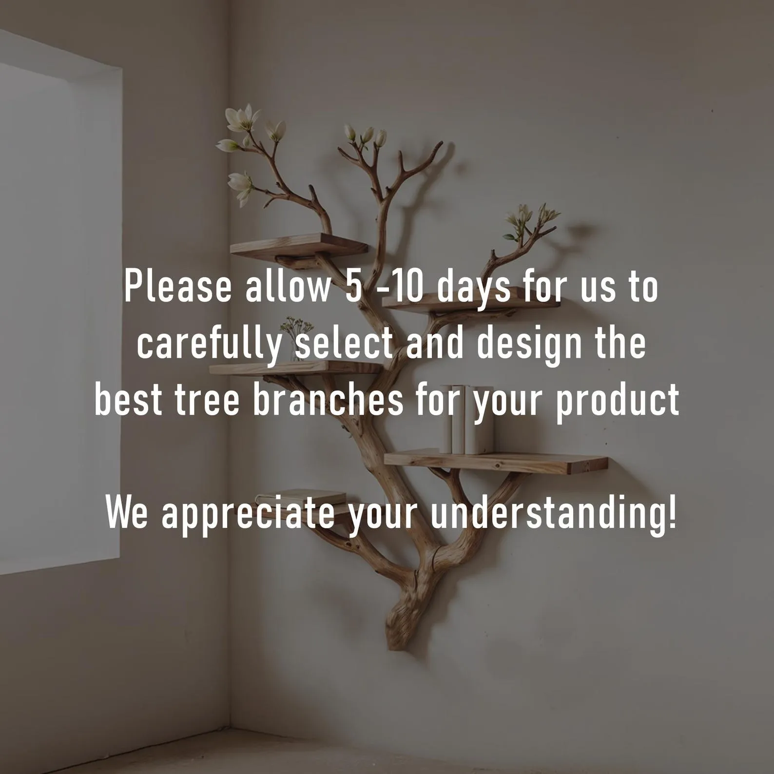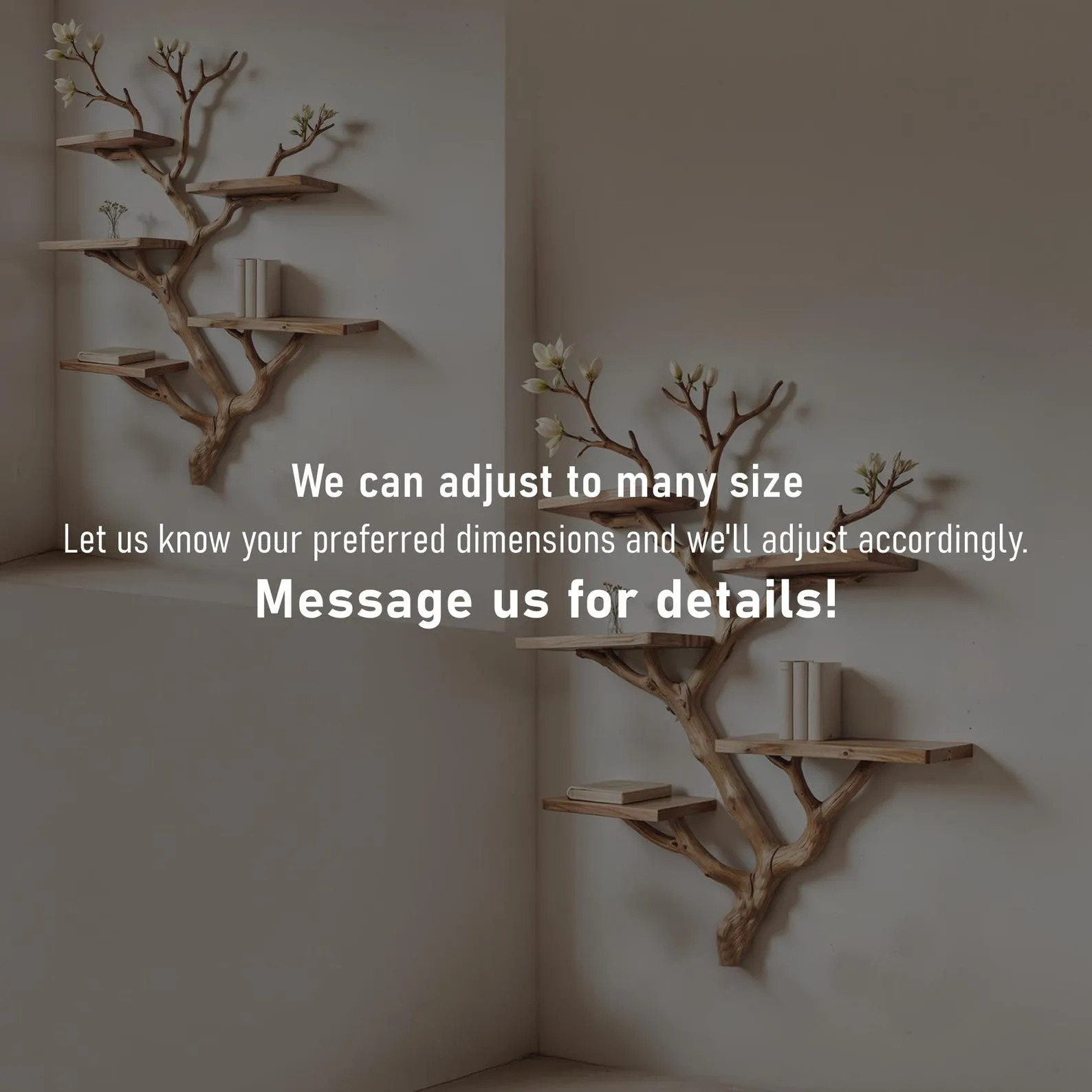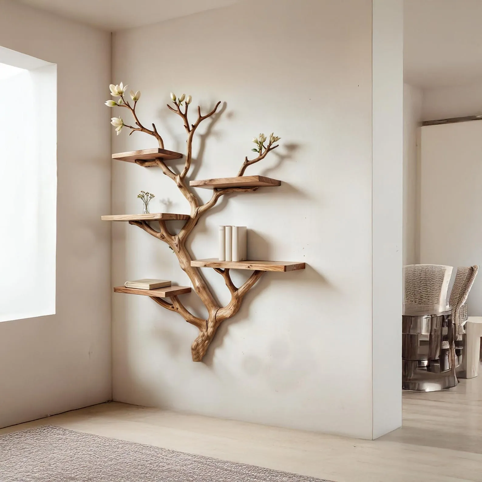 Bring sculptural character to your interior with this natural driftwood tree floating wall bookshelf sculpture. Designed as both functional shelving and wall art, it features branch inspired solid wood forms that create multiple ledges for books, plants, candles, and decor. The warm grain and organic silhouette make it an ideal focal point for living rooms, bedrooms, and reading corners.